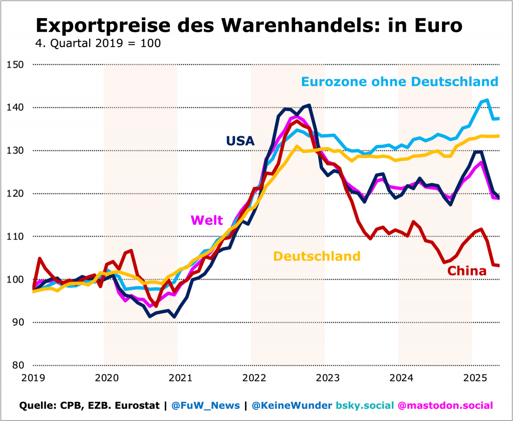 Es könnte geholfen haben, dass die deutschen Exportpreise in Euro gerechnet Ende 2024 langsamer stiegen als diejenigen aus anderen grossen Ursprungsländern. Sowohl Deutschland (+8% seit Jahresanfang) als auch der Rest des Eurogebiets mussten in Dollar gerechnet jedoch einen massiven Anstieg hinnehmen: Die Euroaufwertung wurde kaum für Preissenkungen genutzt, ebenso wenig wie die durch den stärkeren Euro gesunkenen Produzentenpreise für Energie.