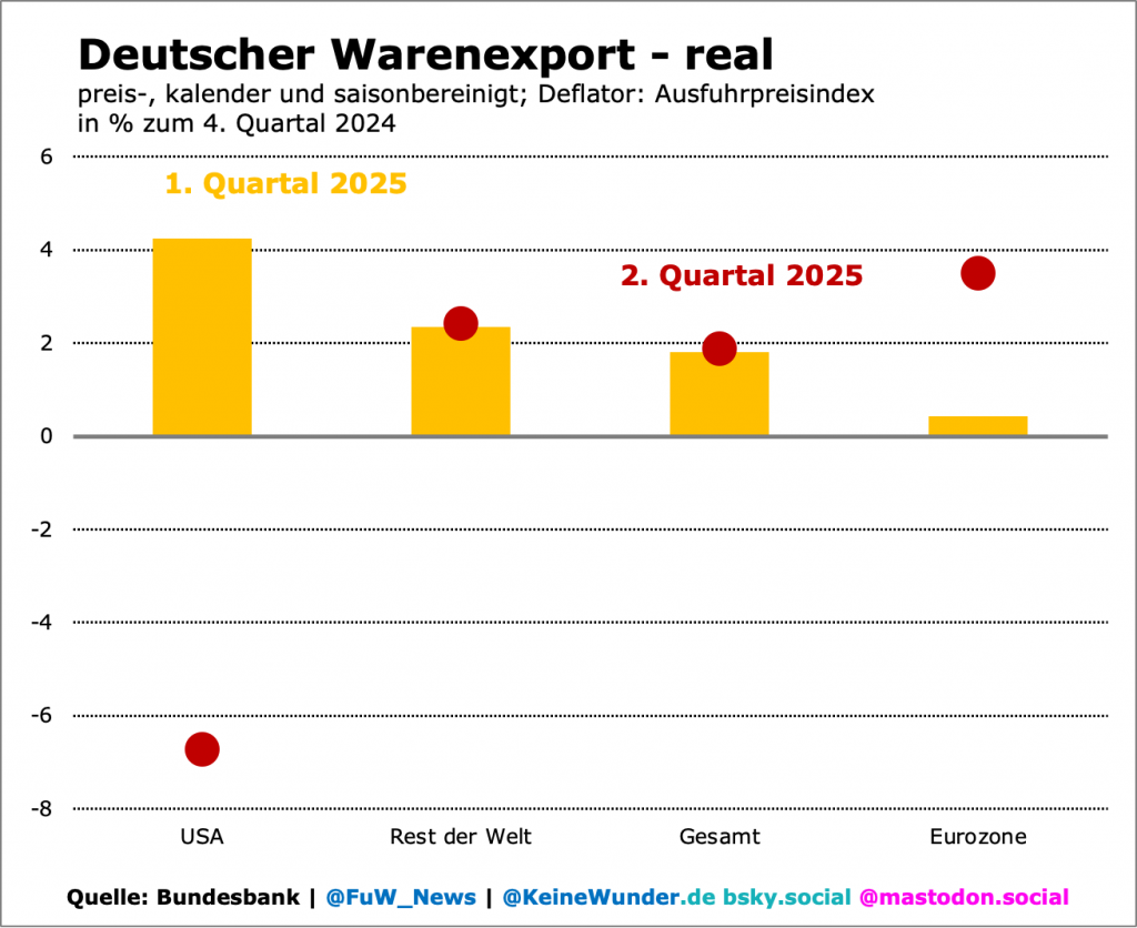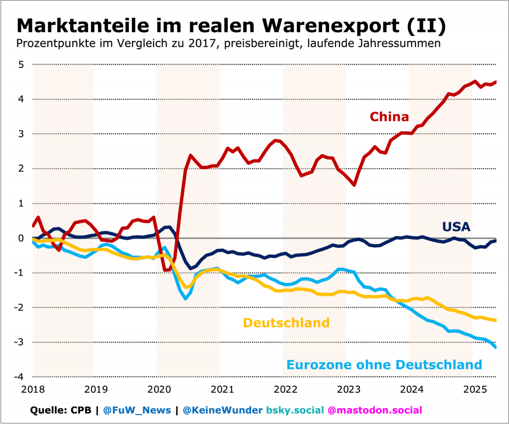 Trotz der anhaltenden Verluste an Marktanteilen im deutschen Export gibt es also Hoffnung für die deutsche Volkswirtschaft. Schliesslich erzielt sie 75% ihrer Umsätze im Inland. Der Warenexport steht auch nur für rund 15% der deutschen Wertschöpfung, was erklärt, warum selbst die US-Zölle von 15% auf die meisten Güter nur geringe Auswirkungen auf das Wachstum haben. Das Kieler Institut IfW schätzt einen dämpfenden Effekt von 0,15% des BIP im nächsten Jahr.