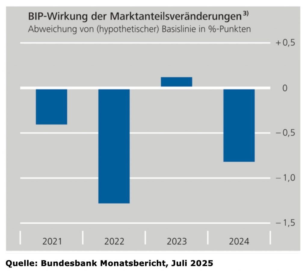 Die anhaltende Schwäche der deutschen Exporte im internationalen Vergleich beschäftigt auch die Ökonomen der Bundesbank. In ihrem Monatsbericht von Juli 2025 untersuchen sie die Verluste der Marktanteile seit 2017. «Das deutsche BIP wäre zwischen 2021 und 2024 um insgesamt 2,4 Prozentpunkte stärker gewachsen, wenn die deutschen Exporte im Einklang mit den Absatzmärkten – also ohne Marktanteilsverluste – gestiegen wären», schreiben die Fachleute.