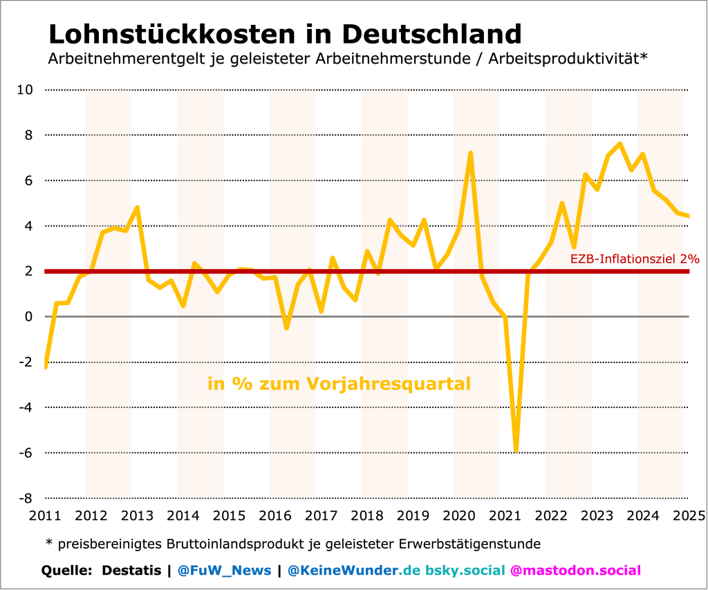Dabei verschweigen die Bundesbankfachleute jedoch, dass die Lohnstückkosten 2012 bis 2021 im Schnitt mit 2% pro Jahr und damit im Rahmen des Inflationsziels gestiegen sind. Übermässig wurde es während der Stagnation ab 2022. Dies ist aber eher zyklischer Natur als Folge des Energiepreisschocks, auch weil es auf die Lohnsteigerungen im Ausgleich der Inflation zurückgeht. Der Anstieg der Lohnstückkosten gibt an, wie stark die Löhne den Zuwachs der Produktivität übertreffen und so zu einer potenziellen Inflationsquelle werden können.