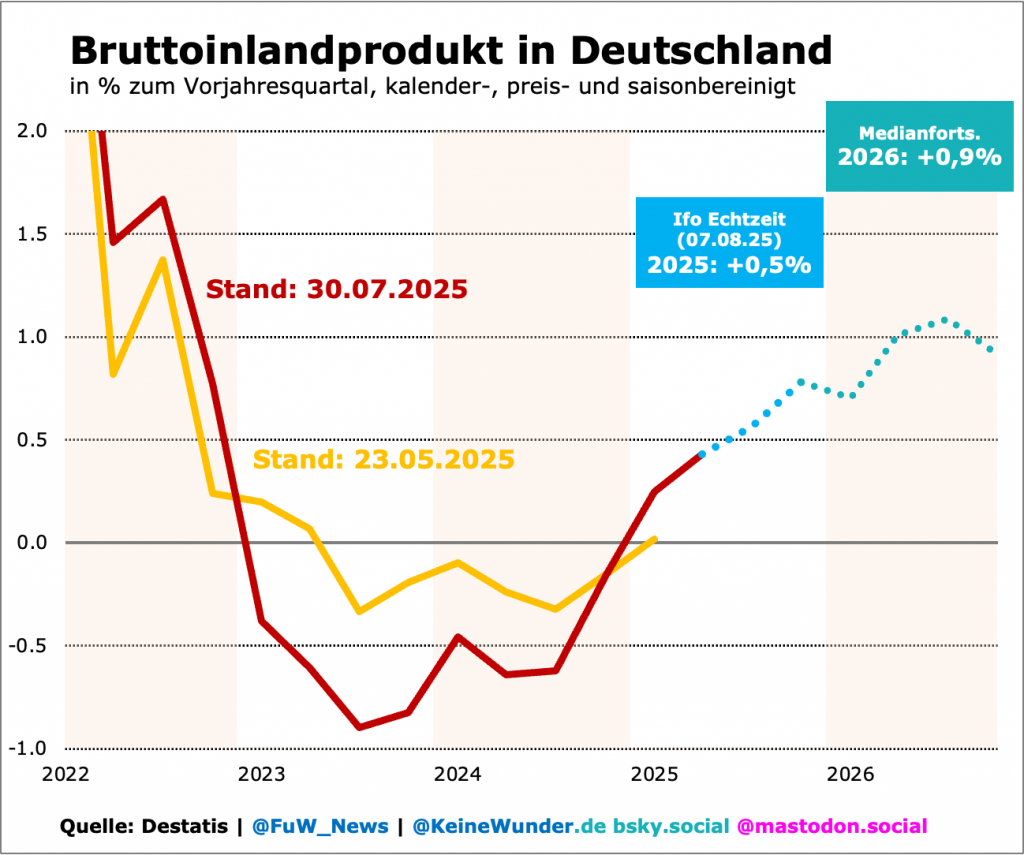 Wie neueste Zahlen des Statistikamtes Destatis zeigen, endete nicht nur eine lange Rezession, die «Putinrezession» gewissermassen, im vergangenen Jahr. Seit dem zweiten Quartal 2024 ging es bereits um 0,4% aufwärts. Nach aktuellem Stand des Ifo-Echtzeitschätzer würde sich ein Plus von 0,5% in diesem Jahr im Vergleich zum Vorjahr ergeben. Eine Fortschreibung mit dem Median der entsprechenden Quartalsraten aus dem Jahr 2025 ergibt für 2026 einen Zuwachs von 0,9%. Das wäre zwar noch kein kräftiger Aufschwung, aber von einer Krise kann keine Rede mehr sein.