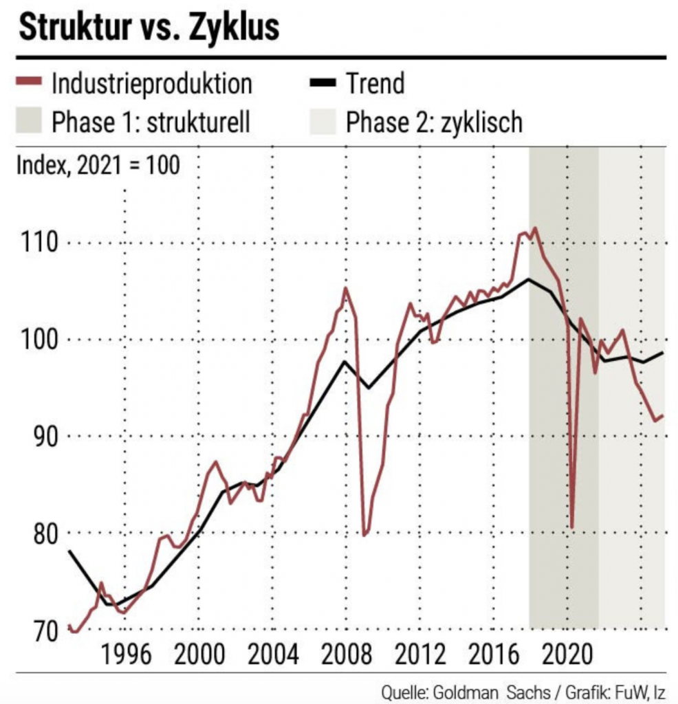 Gemäss Garnadts Studie verläuft der Rückgang der Industrieproduktion in zwei Phasen: Der langfristige Rückgang zwischen 2017 und 2021 wurde hauptsächlich durch den Fahrzeug-, Maschinen- und Anlagenbau verursacht. Der zyklische Rückgang seit der Energiekrise 2022 traf hingegen besonders energieintensive Branchen. Hauptursachen für die Branchenkrise sind die verstärkte Konkurrenz aus China, gestiegene Energiepreise und das langsamere globale Nachfragewachstum.