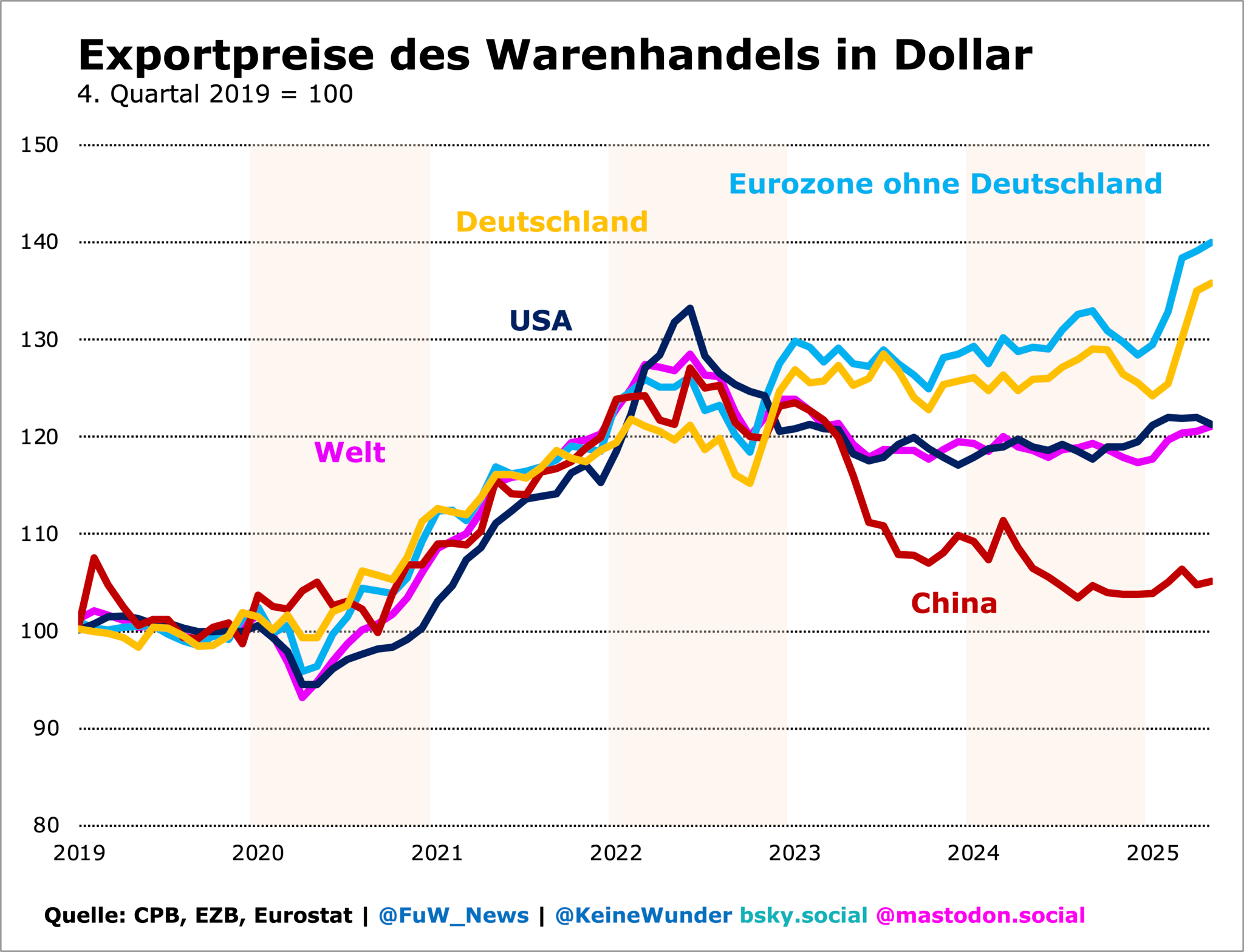 Es könnte geholfen haben, dass die deutschen Exportpreise in Euro gerechnet Ende 2024 langsamer stiegen als diejenigen aus anderen grossen Ursprungsländern. Sowohl Deutschland (+8% seit Jahresanfang) als auch der Rest des Eurogebiets mussten in Dollar gerechnet jedoch einen massiven Anstieg hinnehmen: Die Euroaufwertung wurde kaum für Preissenkungen genutzt, ebenso wenig wie die durch den stärkeren Euro gesunkenen Produzentenpreise für Energie.