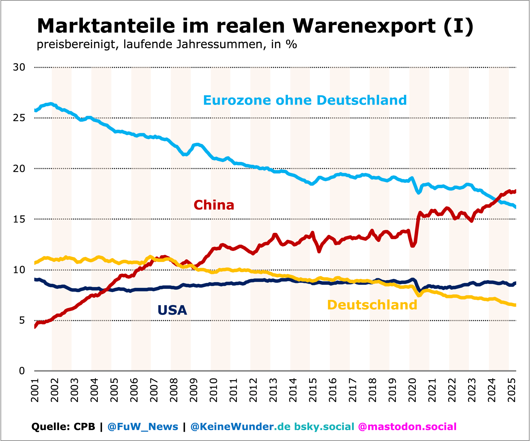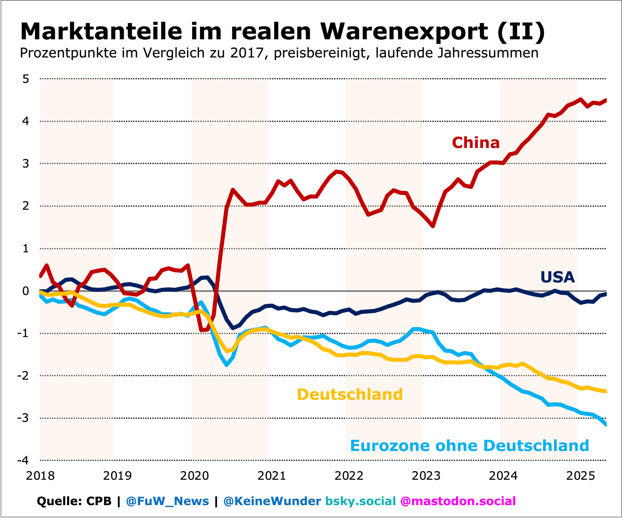 Trotz der anhaltenden Verluste an Marktanteilen im deutschen Export gibt es also Hoffnung für die deutsche Volkswirtschaft. Schliesslich erzielt sie 75% ihrer Umsätze im Inland. Der Warenexport steht auch nur für rund 15% der deutschen Wertschöpfung, was erklärt, warum selbst die US-Zölle von 15% auf die meisten Güter nur geringe Auswirkungen auf das Wachstum haben. Das Kieler Institut IfW schätzt einen dämpfenden Effekt von 0,15% des BIP im nächsten Jahr.