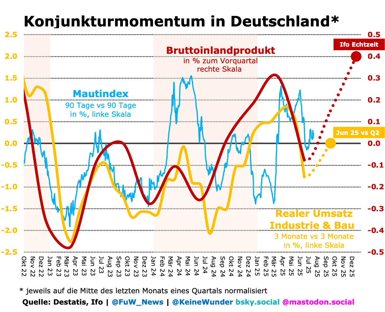 Hinweis: Die Beiträge in diesem Blog erscheinen in Kooperation mit dem Online-Magazin Makronom. Dies ein Update der ursprünlichen Version vom 30. Juli 2025: https://www.fuw.ch/deutschland-steht-im-sommer-2025-vor-einem-zyklischen-aufschwung-255669141438 Worum es hier eigentlich geht, habe ich im ersten Beitrag beschrieben: Konjunkturanalyse geht jeden an – oder warum wir einen Taktikblog der Konjunkturanalyse brauchen.